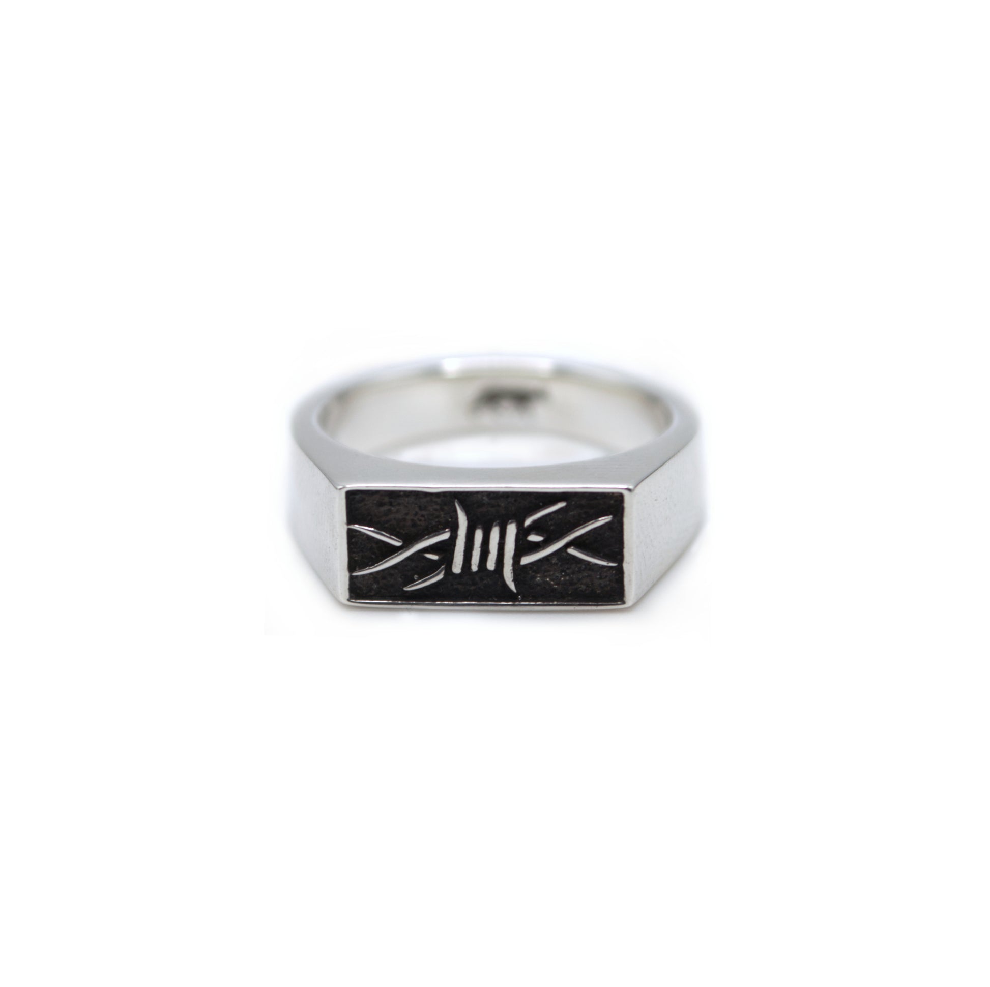Discover BARBELÉ, a unisex ring crafted from recycled sterling silver, meticulously designed to blend aesthetics with sustainability. It features a barbed wire motif created by Tom Lortie, a renowned Canadian tattoo artist, adding character to this elegant piece. The rectangular design and clean lines offer a contemporary look, while the use of recycled silver underscores our commitment to the environment. Whether for a bold everyday style or a special occasion, this ring promises to captivate and inspire.